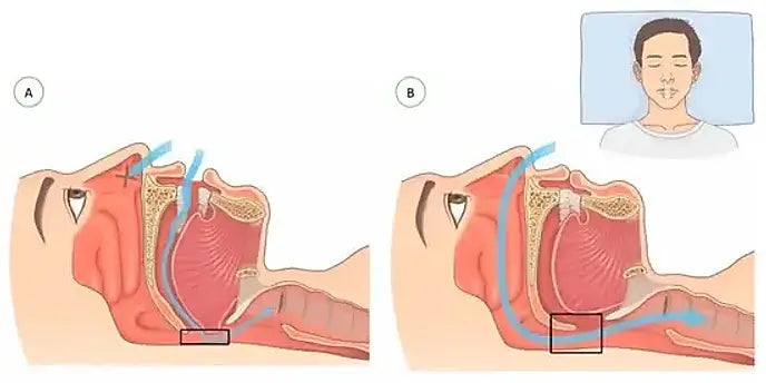 Upper airway resistance during sleep and propensity for obstructive sleep apnea are significantly lower with nasal breathing than with mouth breathing. In the image above you can see the differences between the breathing route of mouth breathing (A) and nose breathing (B).